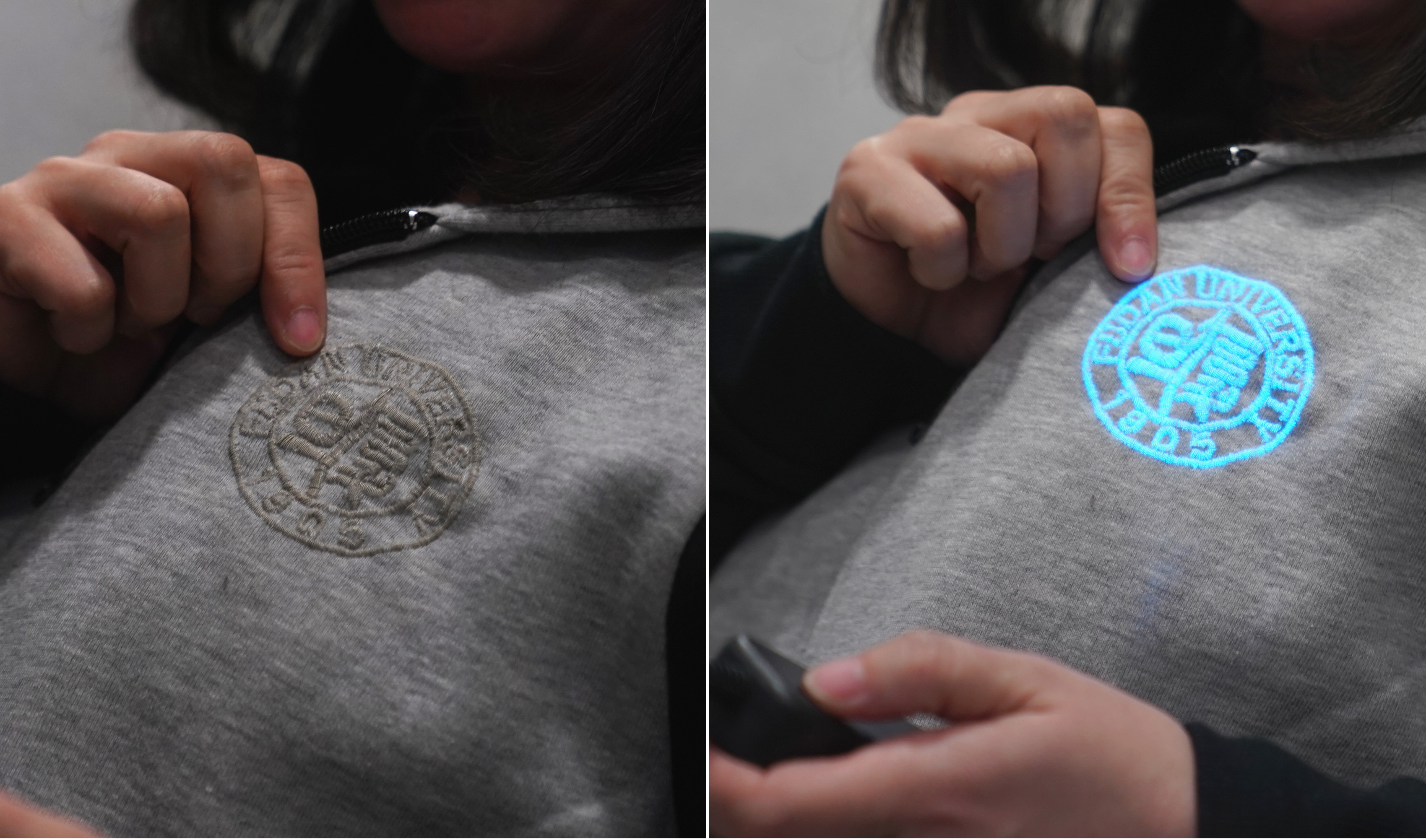 3月10日,复旦大学科研人员展示衣服上用发光纤维绣制的“复旦大学”标志,接通电源后,图案发出明亮蓝光。新华社记者 刘颖摄