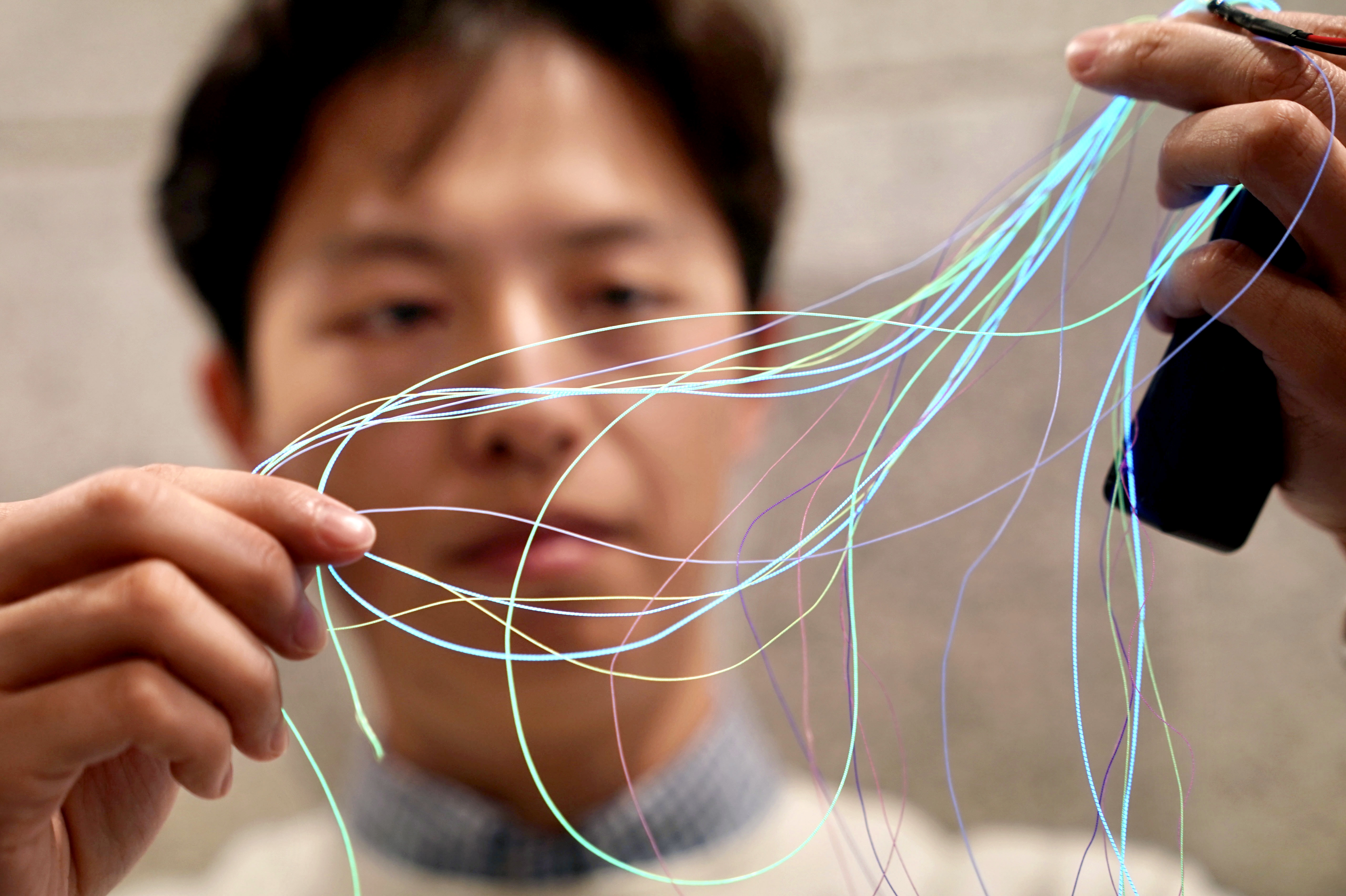 3月10日,复旦大学科研人员展示用于编织的发光纤维。新华社记者 刘颖摄
