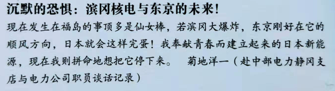 “我奉献青春而建立起来的日本新能源,现在我则拼命想把它停下来。因为我知道,事情发生以后都太晚了。我的女儿告诉我,她是被我盖核电厂的钱养大的,所以她要花一辈子的时间偿还。”