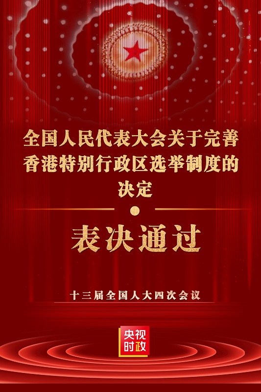 十三届全国人大四次会议表决通过了全国人民代表大会关于完善香港特别行政区选举制度的决定。