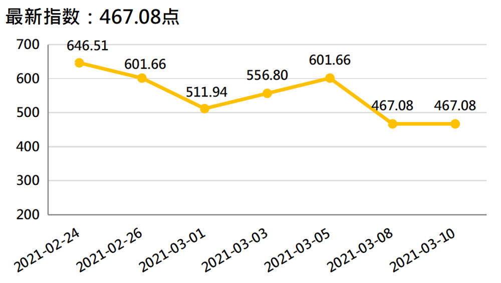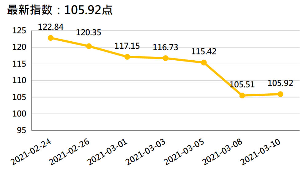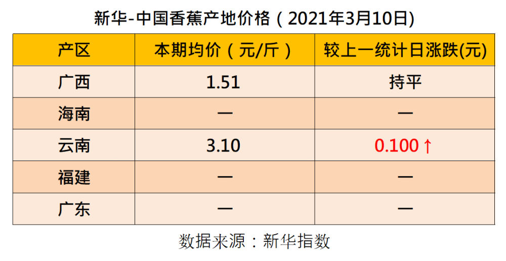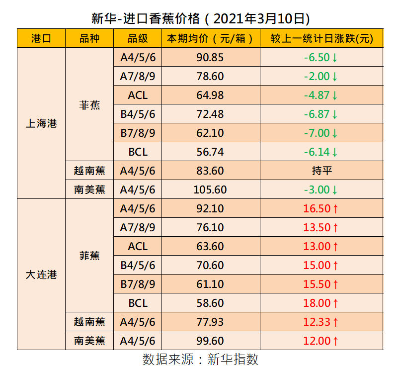 新华财经北京3月11日电(李水艳、李伯罧、薛志烜)新华-中国香蕉产业四大指数显示,截至3月10日,国内香蕉产地价格指数报105.92点,较上一发布日(3月3日,下同)116.73点下跌9.26%;香蕉销地批发价格指数报118.53点,较上一发布日118.09点上涨0.37%;进口蕉价格指数报1018.71点,较上一发布日970.41点上涨4.98%;皇帝蕉产地价格指数报467.08点,较上一发布日556.80点下跌16.11%。