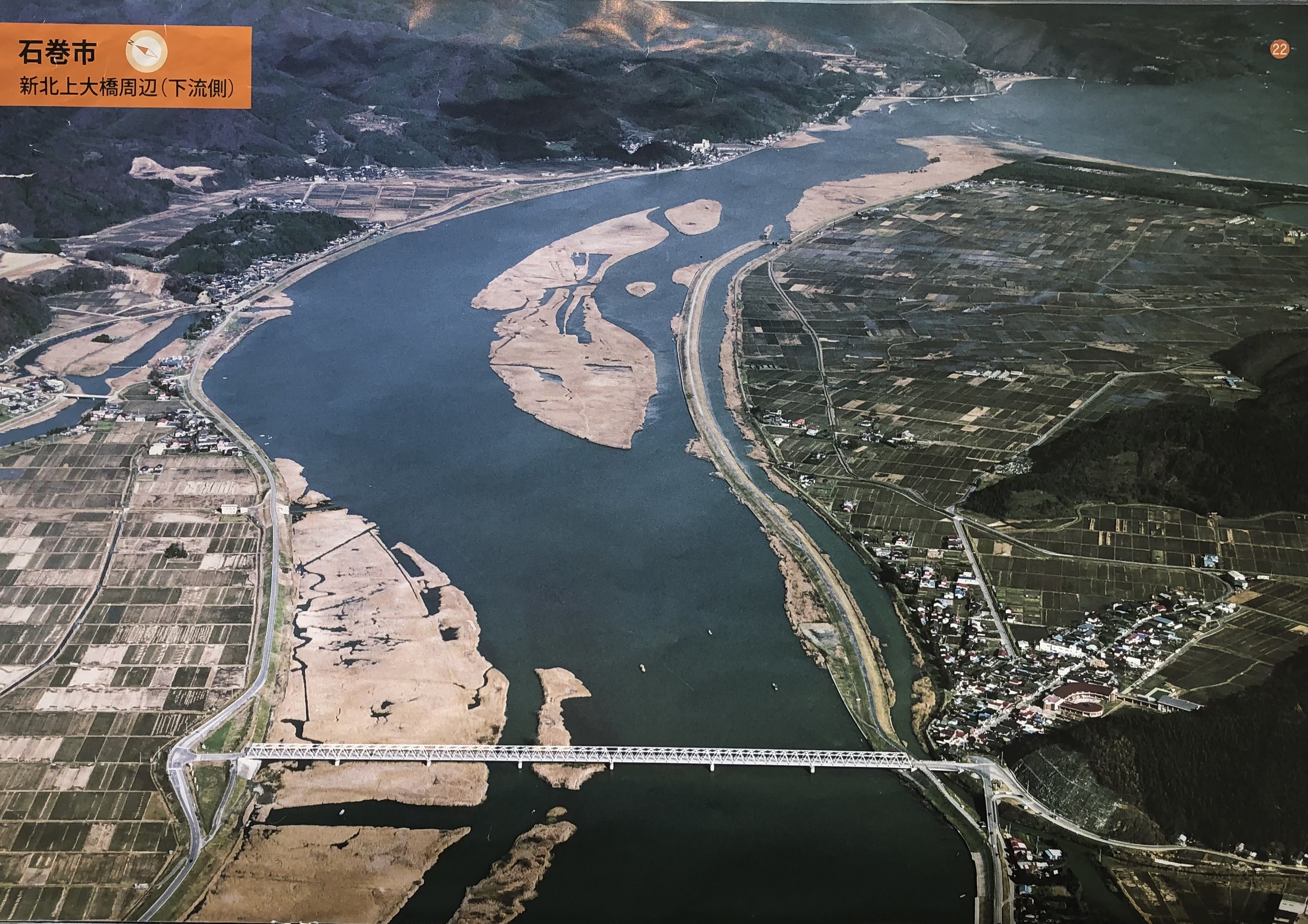 这是3月10日在日本石卷市重建信息交流馆拍摄的一张展出的资料照片,图片上是1985年11月拍摄的新北上大桥一带的景象。新华社记者冮冶摄