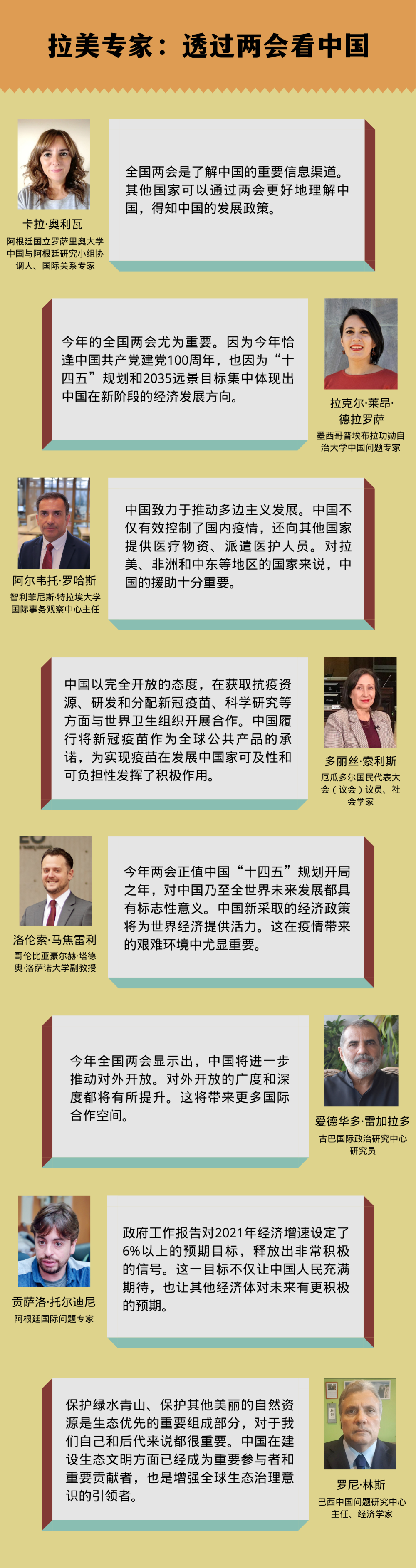 来自阿根廷、墨西哥、智利、厄瓜多尔、哥伦比亚、古巴、巴西等国的专家学者指出,中国两会在推动全球抗疫合作、支持多边主义、助力世界经济复苏、增强全球生态治理意识等方面传递的积极信号,给世界带来更多希望。