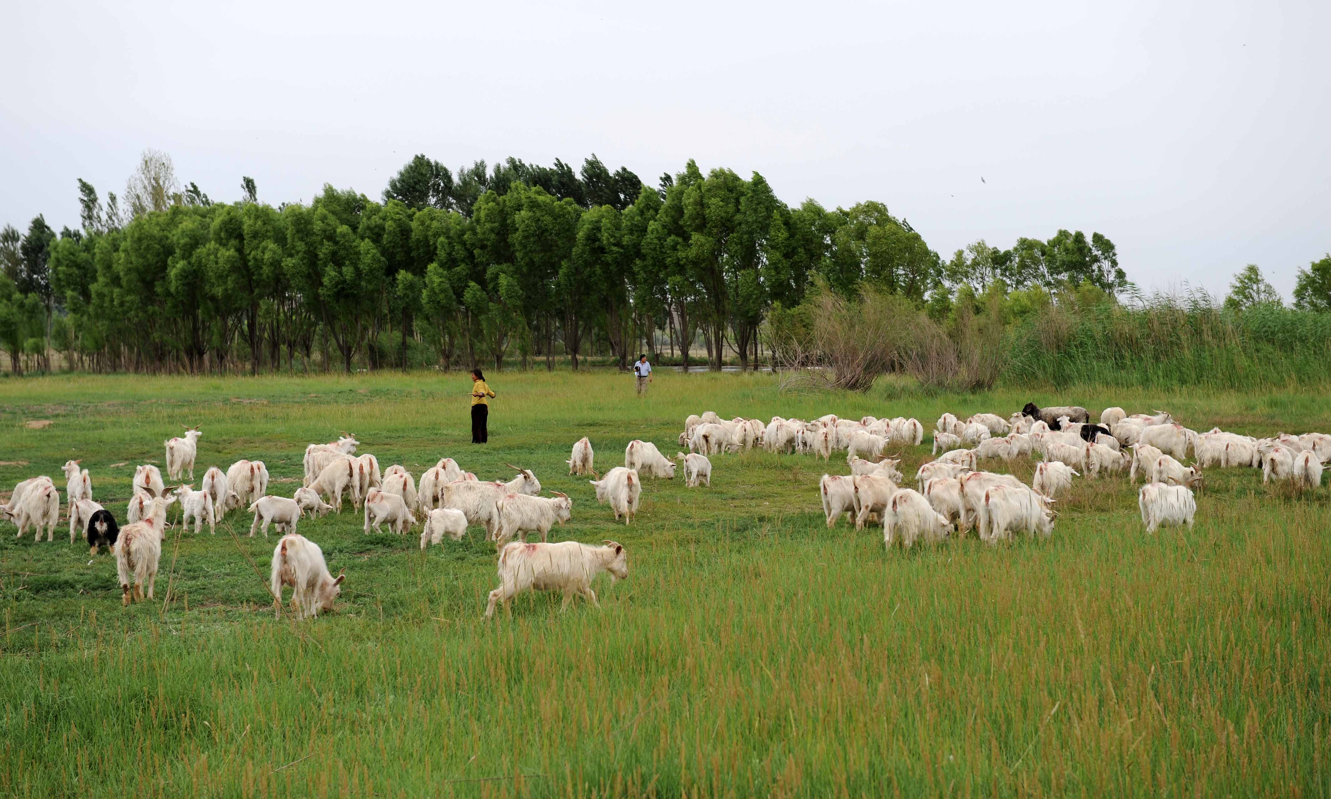 在内蒙古鄂尔多斯市鄂托克旗境内的沙漠绿洲草场上,一名牧人在放羊。新华社记者张领摄