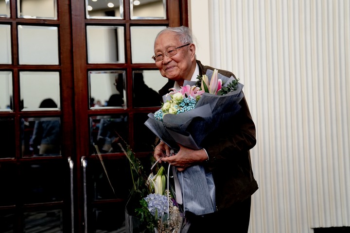 3月10日晚在同济大学上完第一课的汪品先院士,接受学生献花。(新华社记者张建松摄)