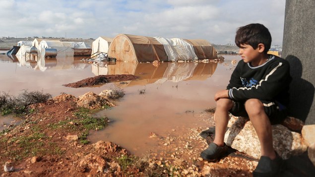 △2021年1月,叙利亚西北部伊德利卜,一名流离失所的男童望着遭洪水淹没的营地