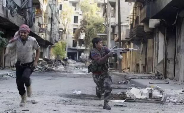 △在叙利亚北部的阿勒颇,一名13岁的男孩拿着枪在街头扫射
