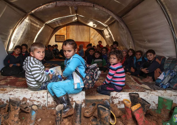 △一群叙利亚儿童被安置在临时搭建的帐篷教室里