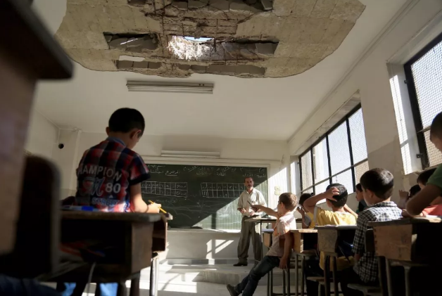 △2017年10月,一位老师在叙利亚首都大马士革东部一间屋顶受损的教室里为学生们讲课