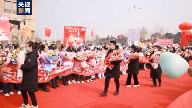 3月11日中午,吉林大学白求恩第一医院的医护人员们举行欢迎仪式,欢迎他们的“战友”回家。