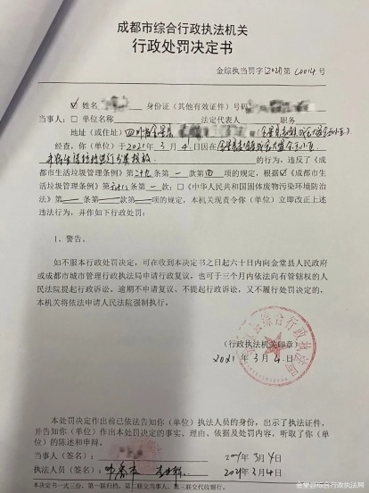 记者在这张垃圾分类罚单具体的行政处罚决定书上看到,该市民的行为违反了《成都市生活垃圾管理条例》第二十九条第一款第四项的规定,根据《成都市生活垃圾管理条例》第六十八条第一款的规定,责令其立即改正上述违法行为,并作如下行政处罚:警告。