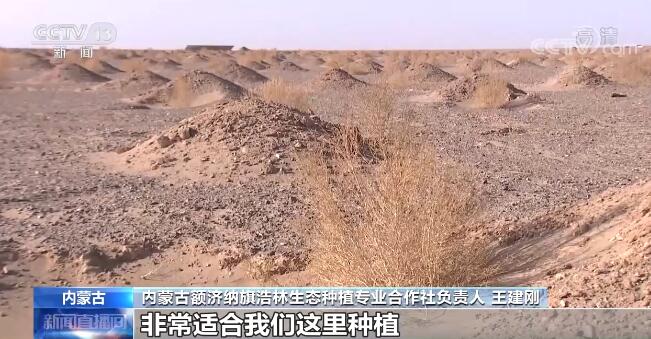 内蒙古额济纳旗浩林生态种植专业合作社负责人 王建刚:我们种植的梭梭根系特别发达,具有抗旱、耐高温、耐盐碱、耐风蚀等特点,是一种极其重要的防风固沙植物,非常适合我们这里种植,今年我们要种5万亩。