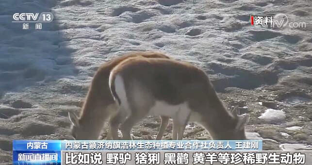 内蒙古额济纳旗浩林生态种植专业合作社负责人 王建刚:通过持续不断地植树造林,不仅环境绿化变美了,而且以前很少见到的野生动物,比如说野驴、猞猁、黑鹳、黄羊等珍稀野生动物,现在也能在我们这里看到了。