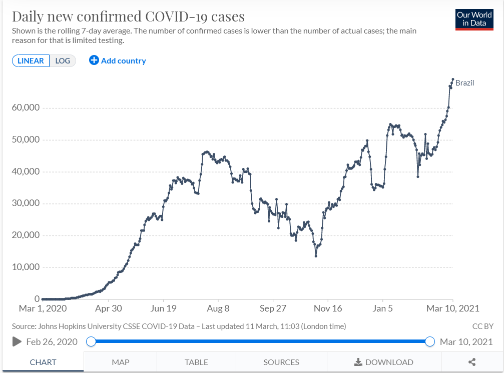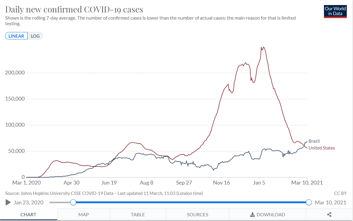 △3月7日起,巴西单日新增新冠肺炎确诊病例数均超越美国(图片来源:Our World in Data)