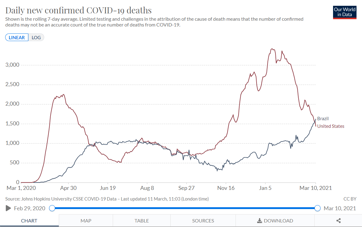 △3月9日起,巴西单日新增新冠肺炎死亡病例数均超越美国(图片来源:Our World in Data)