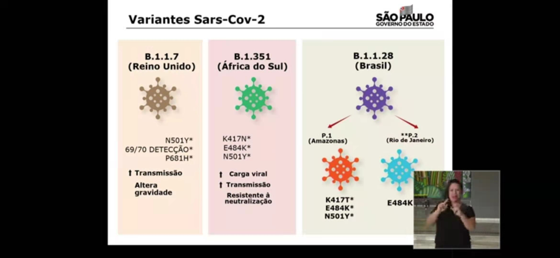 巴西权威医疗科研机构布坦坦研究所所长迪马斯·科瓦斯表示,在巴西、英国及南非出现的B.1.1.7、B.1.315和B.1.1.28三种变异病毒均已在巴西新冠肺炎患者身上被检测到。研究人员表示,英国发现的变异病毒具有更强的传染性且可加重感染症状,其致死率较普通病毒高出64%;南非发现的变异病毒基因组携带E484K突变,这个突变有可能增强新冠病毒的传染性,并可能降低人体内抗体的有效性;同样携带有E484K突变的P.1变异病毒是在巴西传播最为广泛的,其危险程度与以上两种变异病毒相当。