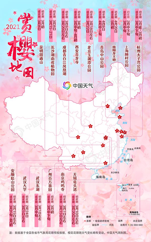 在北京,下周将可能迎来今年第一朵樱花的绽放,3月22日前后将进入盛花期;青岛中山公园的初花期预计在4月6日;辽宁旅顺的花期更晚,4月20日左右初开,5月才迎来盛花期;在贵州的安顺,由于海拔较高,初花期与同纬度地区相比也稍稍偏晚。