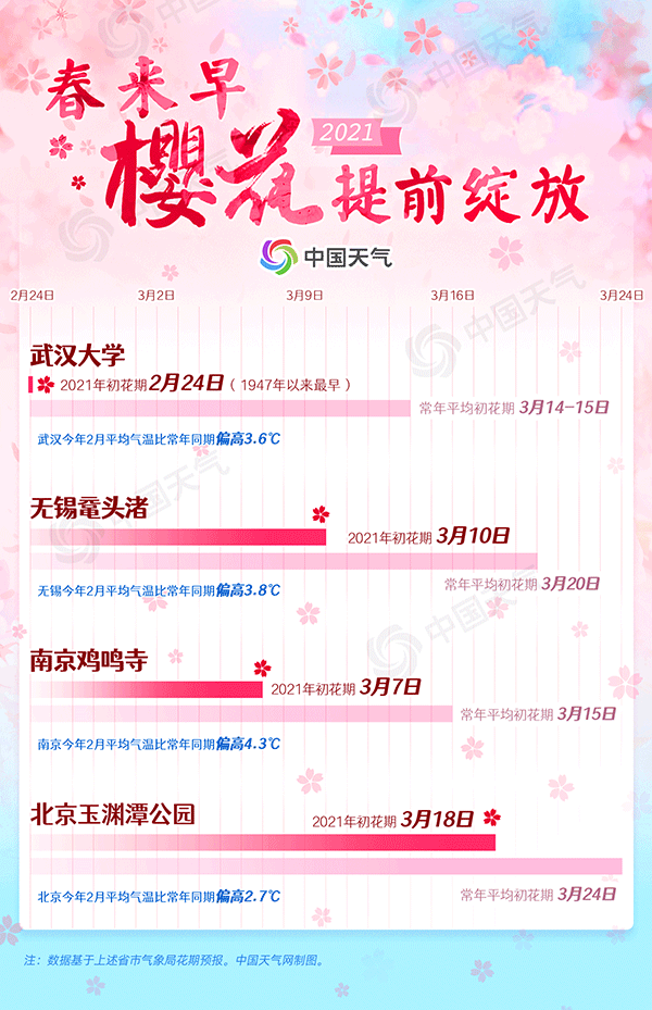 无锡刚刚经历了“史上最热2月”,气温提前催开了樱花。鼋头渚等景区初花期比常年提前了10天左右;南京今年2月气温与常年相比偏高4.3℃,鸡鸣寺樱花也已经提前绽放;在北京,今年初花期预计在3月18日,也比常年提前了一周左右。