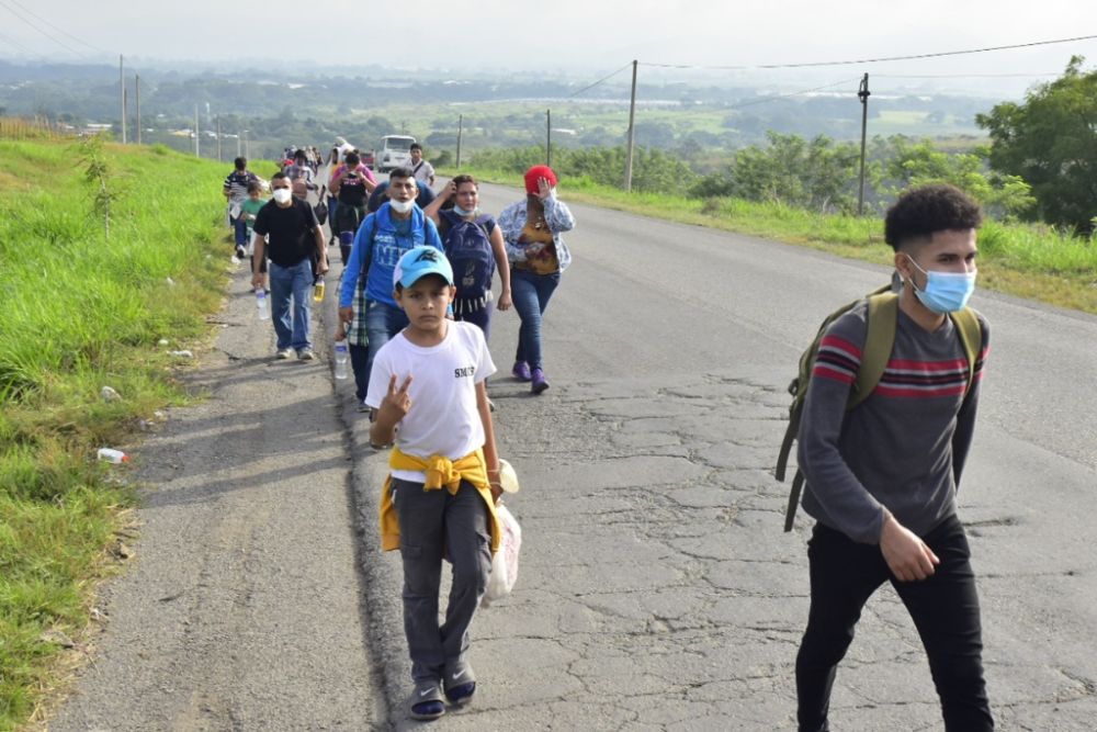 1月15日,在洪都拉斯北部城市科夫拉迪亚,中美洲民众在当地公路上行进,寻求前往美国。(新华社发)