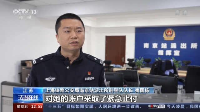 上海铁路公安局南京站派出所刑警队队长 夷国栋:第一时间通过她的手机调取了转账的相关记录。根据相关的记录,公安机关联系了有关部门,对他的账户采取了紧急止付。可当时嫌疑人比较狡猾,采取了多账户分流的方式,把这个资金给转移了。