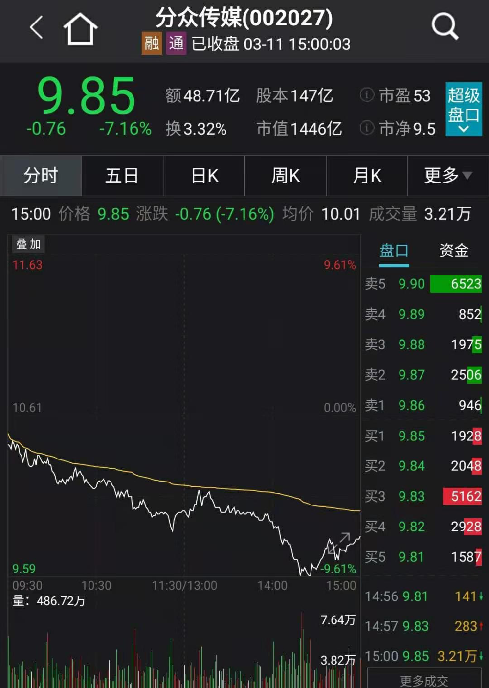 新华社北京3月12日电(中国证券报记者于蒙蒙)传媒板块的龙头企业分众传媒,昨天盘中一度触及跌停,截至收盘下跌7.16%,全天成交近49亿元。