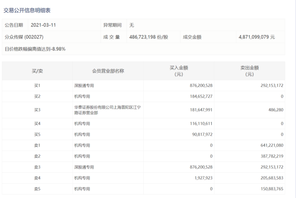 中国证券报记者注意到,卖一位置的机构卖出6.41亿元,该交易量规模较大,对比分众传媒机构股东的持股量,仅有9家机构持股量超过6000万股,符合卖一位置的卖出量。
