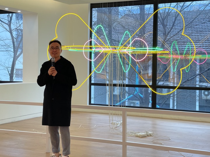 上海玻璃博物馆馆长张琳在介绍装置艺术作品《蝴蝶》。 新华社记者 孙丽萍 摄
