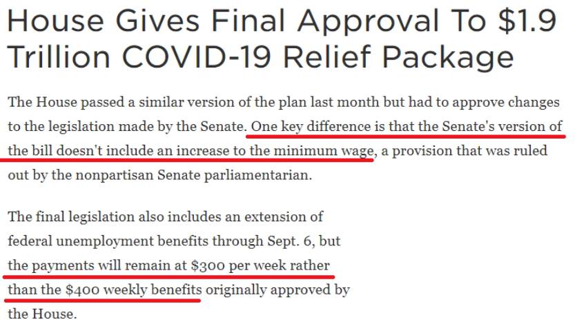 此次通过的1.9万亿美元救助法案是去年以来的第三轮,也是拜登政府上台后首轮救助,内容包罗万象:包括向中低收入家庭发放一次性1400美元救助金、扩大儿童免税额等“看得见”的福利内容;但最终版本中少了民主党人提出的最低工资标准。此外,其他一些项目也与民主党最初版本相比有所调整,例如,联邦政府每周将增加300美元失业救济金,而不是众议院最初批准的每周400美元……事实上,这个从提出到走到今天这步的巨额支出法案是一步一个坎。