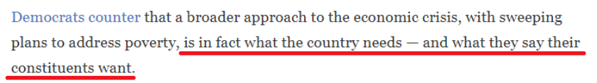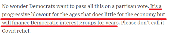 《华尔街日报》评论称,新一轮救助法案对经济没有什么帮助,但将为民主党利益集团提供多年的资金。美国全国公共广播电台(NPR)援引民主党人反驳的话称,“用更广泛的方法来应对经济危机,用全面的计划来解决贫困问题,这实际上是这个国家所需要的,也是选民所希望的”。
