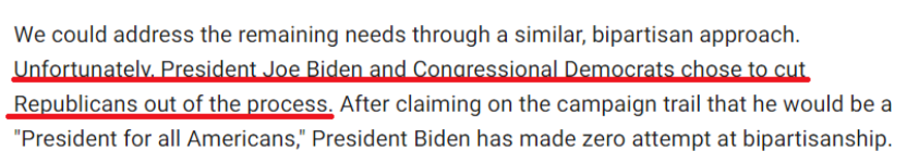 福克斯新闻报道则称,“拜登和民主党人选择将共和党人排除在这一进程之外”。报道指责拜登在总统竞选活动中称他将成为“所有美国人的总统”,但“从未尝试过推动两党合作”。