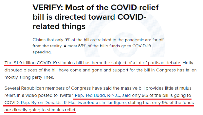 根据美国广播公司(ABC)的报道,1.9万亿美元法案一直是党派辩论的主题,国会对该法案的支持主要是按照党派立场进行的。对于资金的具体流向,不同的人会得出不同的答案。几名国会共和党议员说,这个庞大的法案几乎不能缓解经济刺激的压力。参议院少数党领袖米奇·麦康奈尔和北卡罗来纳州共和党众议员特德·巴德均表示,法案中只有9%的钱用于疫情救助;佛罗里达州共和党众议员拜伦·唐纳德在社交网站上发布了一个类似的数据,称只有9%的资金直接用于刺激经济。美国广播公司的报道指出,这一说法与事实不符,救助法案中大约有85%的资金用于和新冠肺炎疫情相关的支出。