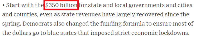 一直对该法案持批评态度的“负责任联邦预算委员会”(CRFB)则估计,约有3000亿美元——相当于该法案的15%——将用于“与当前危机没有直接关系的(民主党)长期政策优先事项”。《华尔街日报》报道提到,法案规定向州和地方政府、市和县拨款3500亿美元,这是民主党为了确保大部分资金流向实行严格经济封锁的蓝色州;福克斯新闻报道称,民主党人以疫情防控为借口,要求拨款1亿美元在众议院议长南希·佩洛西的选区外修建一条隧道……