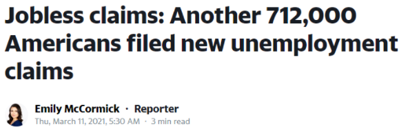 眼下,美国社会仍在疫情和经济的双重泥沼中苦苦挣扎。美媒最近的一项民调显示,大约一半的美国民众表示,疫情期间他们的家庭收入比之前缩水。此外,就业形势持续低迷。根据美国劳工部当地时间11日发布的数据,截至3月4日的一周,美国首次申请失业救济的人数为71.2万,继续维持在高位。