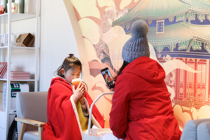 沈阳故宫斯文门外的清文化元素主题咖啡馆日前开门纳客,店内推出的多款“网红”饮品引话题无数,吸引观众前去打卡。图片为顾客在咖啡馆内拍照。照片由沈阳故宫博物馆提供。