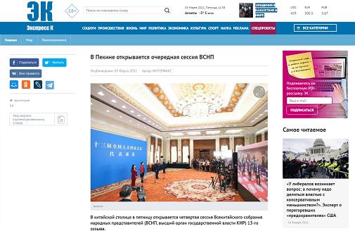 5日,哈萨克斯坦多家媒体关注中国十三届全国人大四次会议开幕。