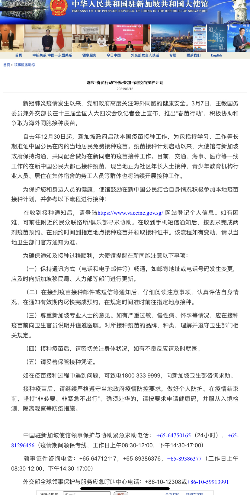 中国驻新加坡大使馆今日(12日)向在新同胞发出接种疫苗温馨提醒。