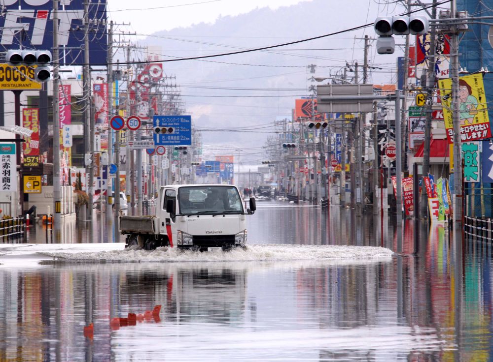 2011年3月15日,在日本宫城县石卷市,一辆卡车在水中行驶。新华社记者陈建力摄