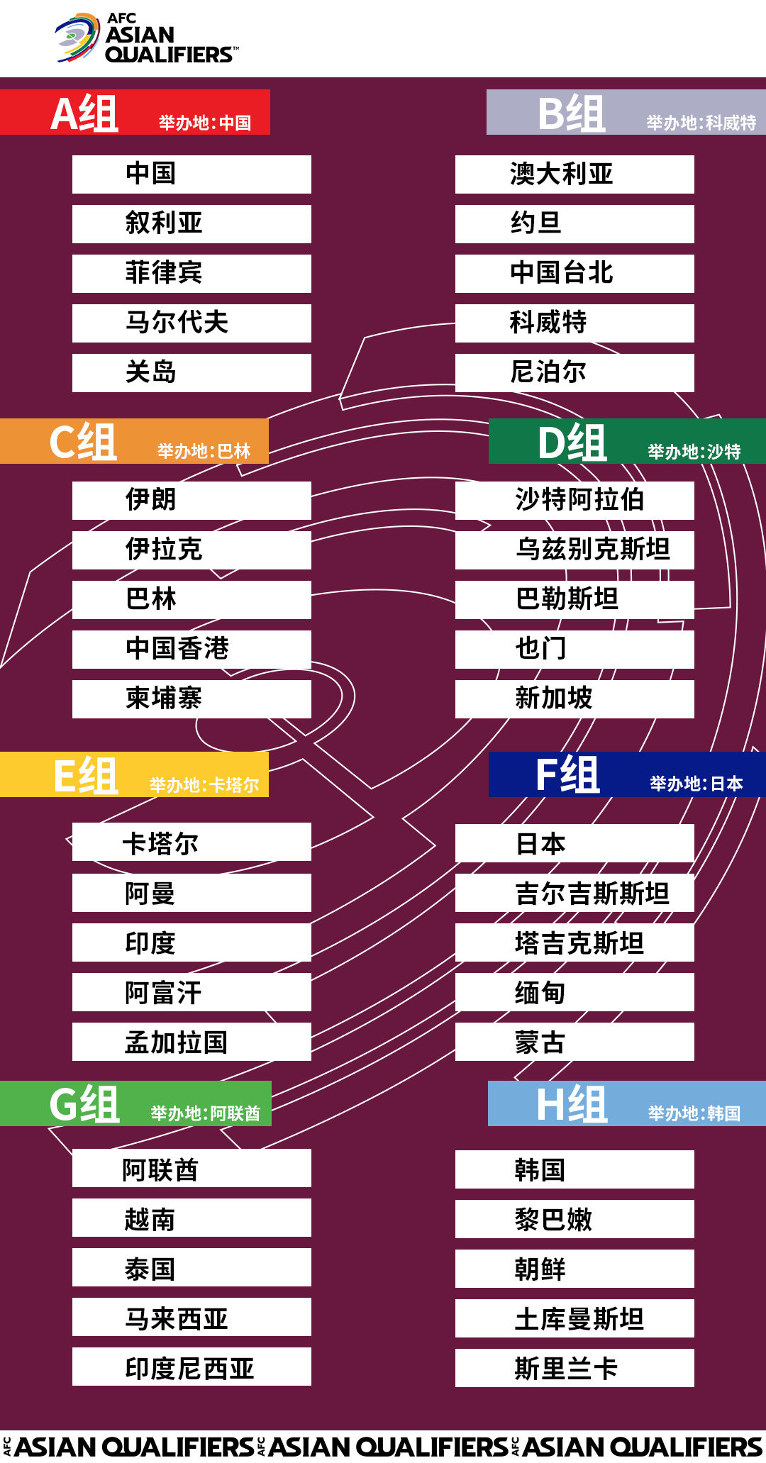 亚足联发布2022年卡塔尔世界杯亚洲区第二轮预选赛暨中国亚洲杯预选赛所有组别比赛地点如下: