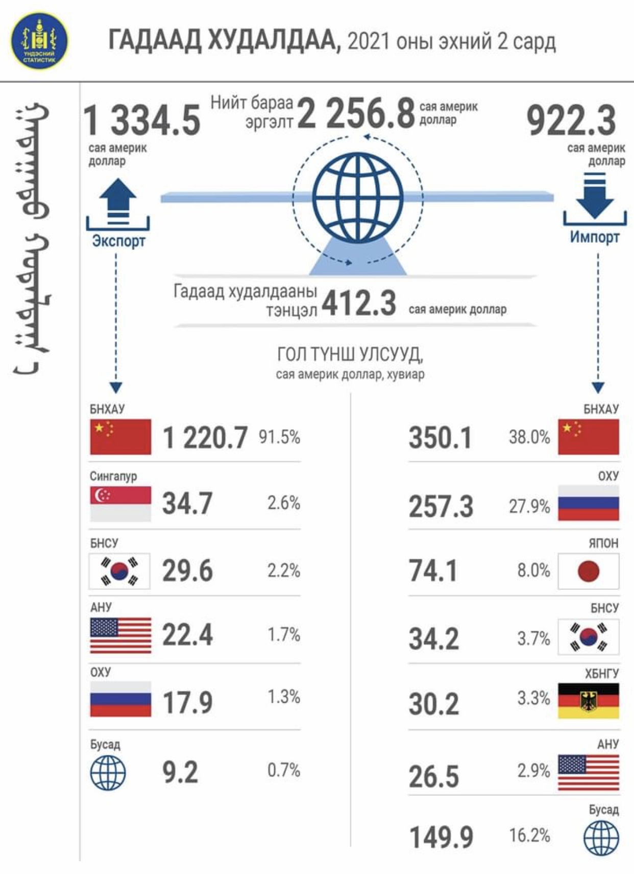 当地时间3月12日,蒙古国国家统计委员会公布的统计数据显示,2021年前2个月蒙古国同世界112个国家和地区进行贸易,外贸总额达23亿美元,同比增加7亿3610万美元,增长48.4%。其中,同中国的贸易额达16亿美元,占同期外贸总额的69.6%。