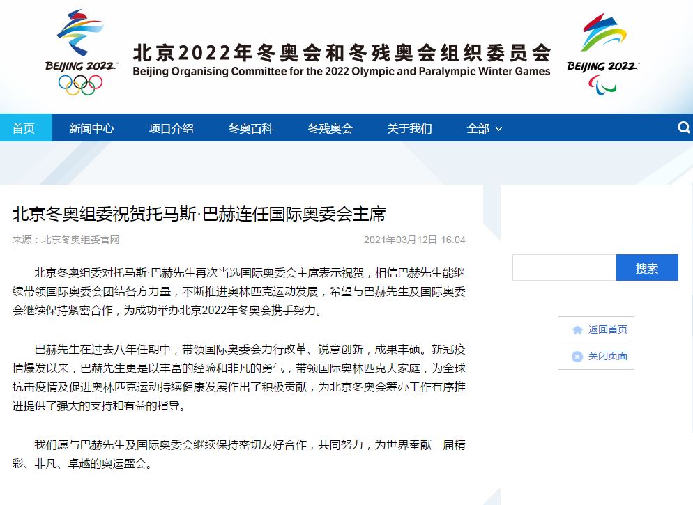 北京冬奥组委在官网表示,巴赫在过去八年任期中,带领国际奥委会力行改革、锐意创新,成果丰硕。新冠疫情暴发以来,巴赫更是以丰富的经验和非凡的勇气,带领国际奥林匹克大家庭,为全球抗击疫情及促进奥林匹克运动持续健康发展作出了积极贡献,为北京冬奥会筹办工作有序推进提供了强大的支持和有益的指导。