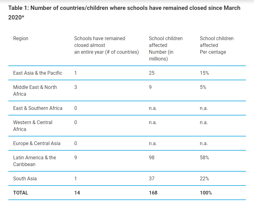 △该图表显示了自2020年3月以来,各国一直关闭的学校数量和因此受影响的儿童人数