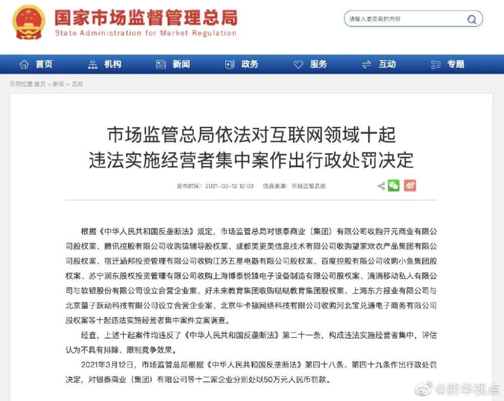 市场监管总局依法对互联网领域十起违法实施经营者集中案作出行政处罚决定,对银泰商业(集团)有限公司等12家企业分别处以50万元人民币罚款。