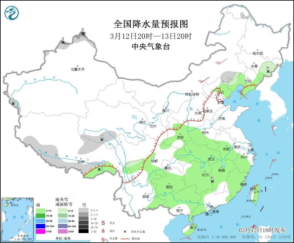 3月12日20时至13日20时,新疆北疆北部和西南部山区、西藏南部、青海南部、内蒙古东南部、吉林东部等地部分地区有小雪或雨夹雪,其中,新疆北疆北部等地局地有中到大雪。辽宁中南部、河北东北部、北京东北部、陕西中南部、黄淮西部、江汉、江南大部、四川盆地南部、重庆北部、贵州大部、云南东部、华南大部、台湾岛等地部分地区有小雨。内蒙古中东部、辽东半岛等地部分地区有4~5级风。