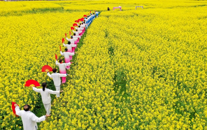 湖南省衡阳市衡阳县库宗桥镇华山村,太极爱好者在油菜花田里表演太极扇。