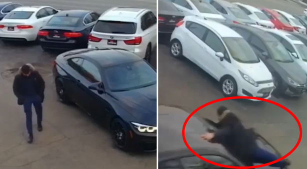 ·加拿大两名小偷冒充顾客盗走宝马车,销售阻拦被顶在引擎盖上行驶。