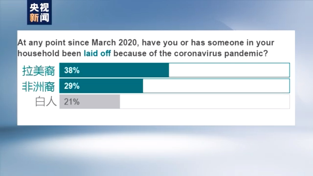38%的拉美裔和29%的非洲裔美国人说,他们的家庭中有人在疫情期间被解雇了。美国白人中同样情况的只有21%。