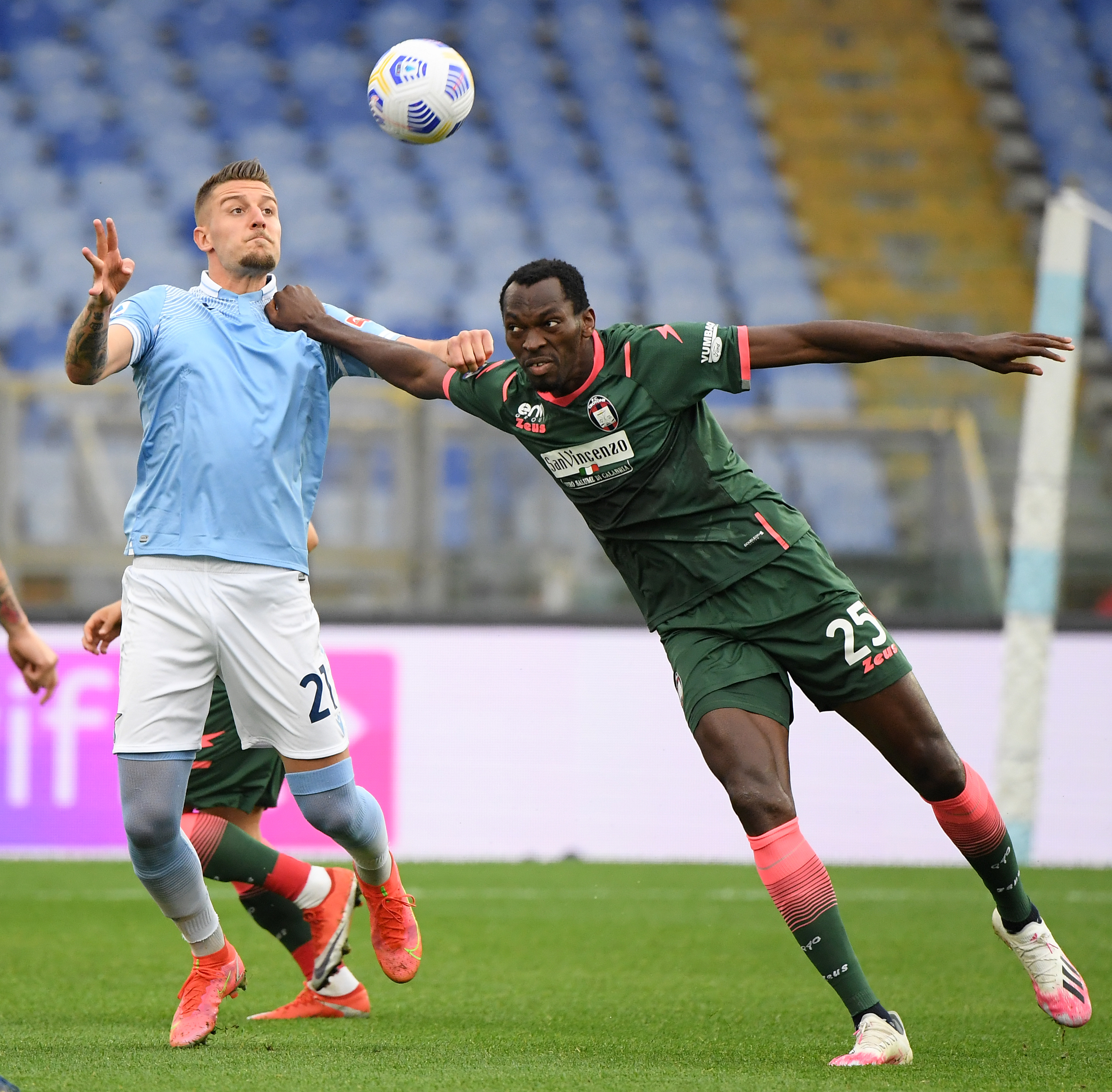 3月12日,拉齐奥队球员米林科维奇·萨维奇(左)在比赛中和克罗托内队球员恩万科沃拼抢。新华社发(阿尔贝托·林格利亚 摄)