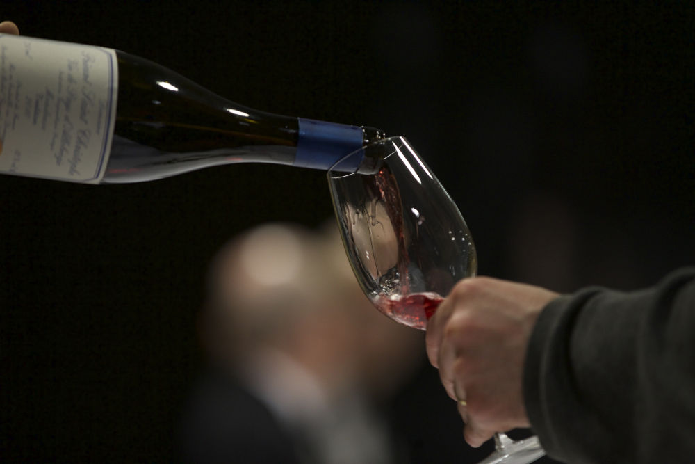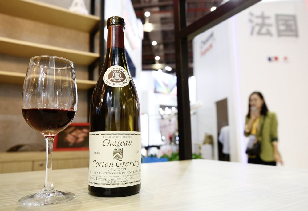 图为2019年11月5日在第二届进博会法国国家馆拍摄的法国路易拉图科尔登-格兰塞干红葡萄酒。(新华社记者张玉薇摄)