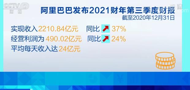 阿里巴巴集团此前发布2021财年第三季度,也就是2020年第四季度的财报显示,截至2020年12月31日,该季度阿里巴巴实现收入2210.84亿元,同比增长37%;经营利润为490.02亿元,同比增长24%。这意味着,在此季度里,阿里巴巴平均每天收入达24亿元。