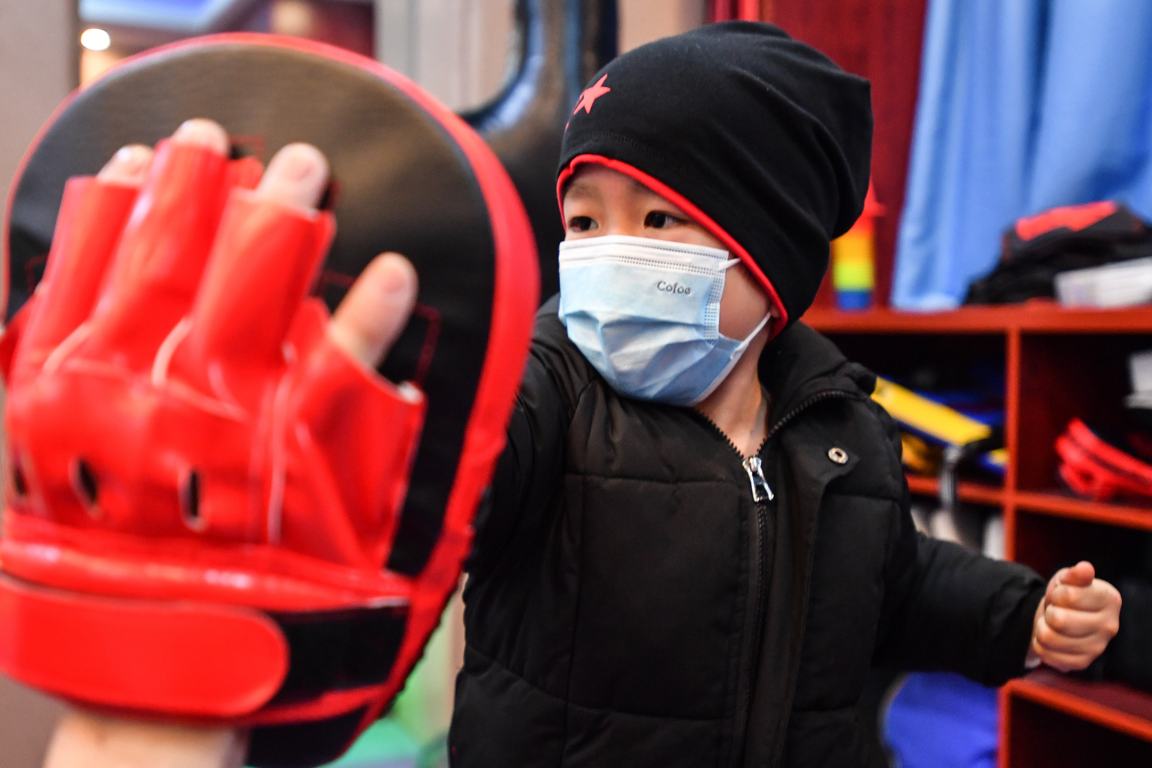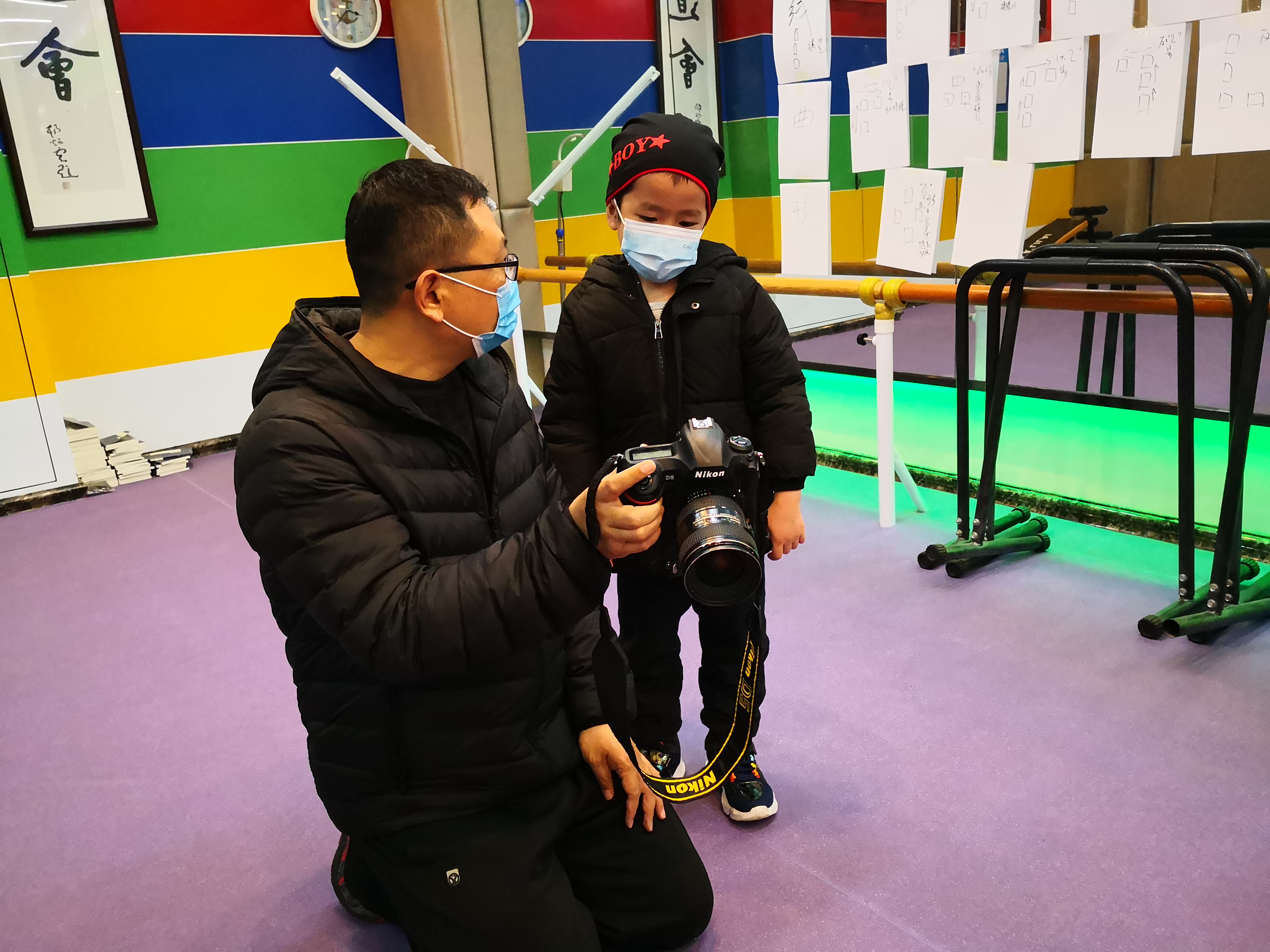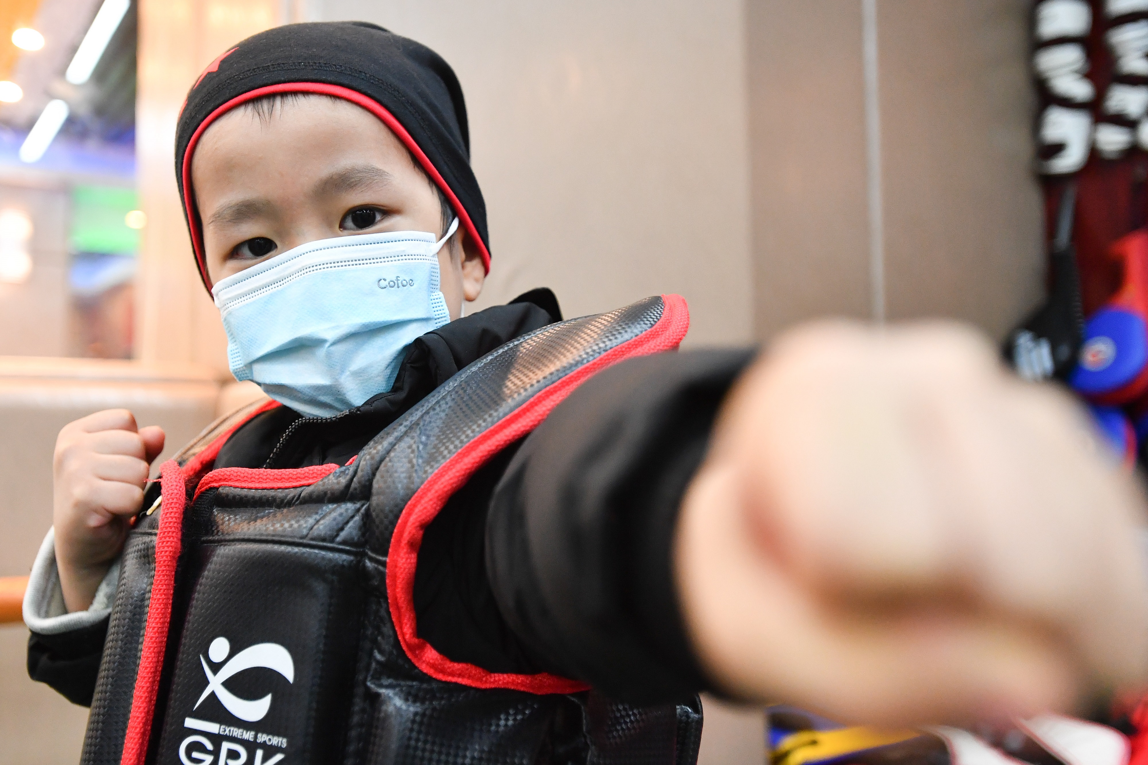 阳阳身着道馆为其定制的黑色跆拳道道服